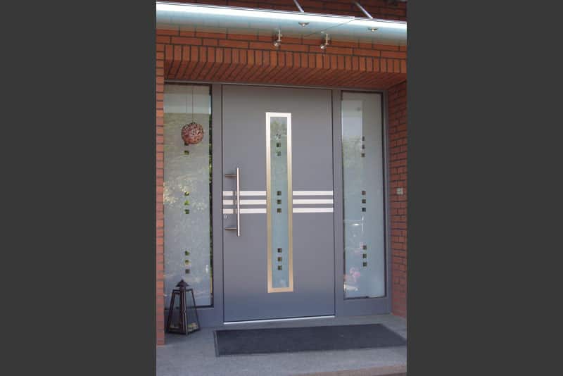 Aluminiumhaustür mit festen Glasseitenteilen und flächiger Füllung.