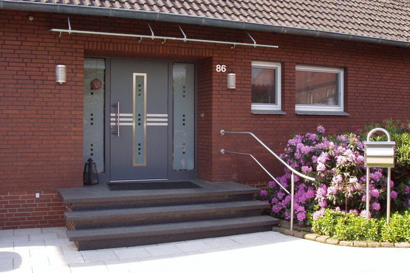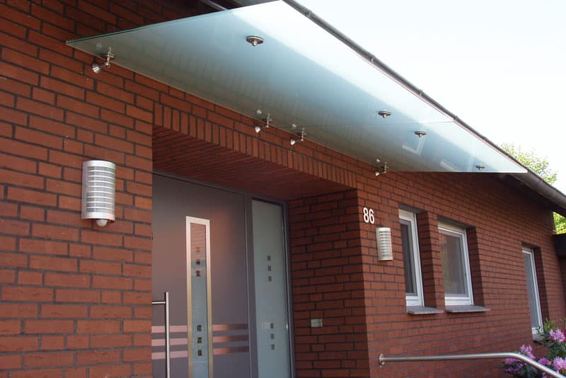 Das Verbundsicherheitsglas (VSG) mit hellmatter Folie in Verbindung mit der Edelstahlhalterung gibt dem Eingangsbereich Schutz.