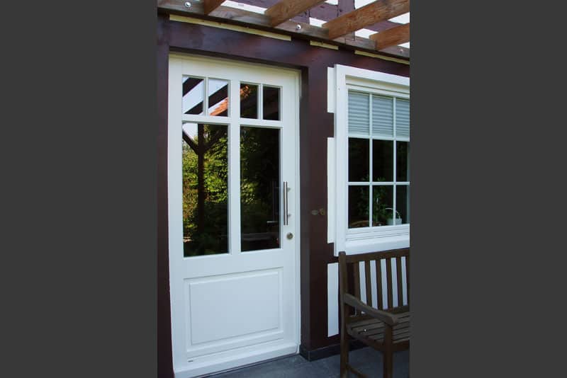 Nebeneingangstür mit Türbekleidung aus massiver Eiche mit aufgesetztem Sprossenrahmen im Türelement und Oberlicht.