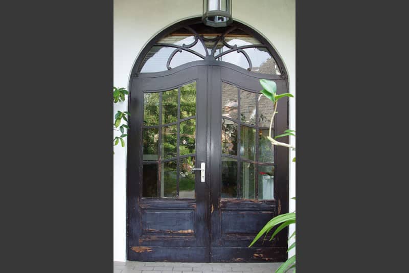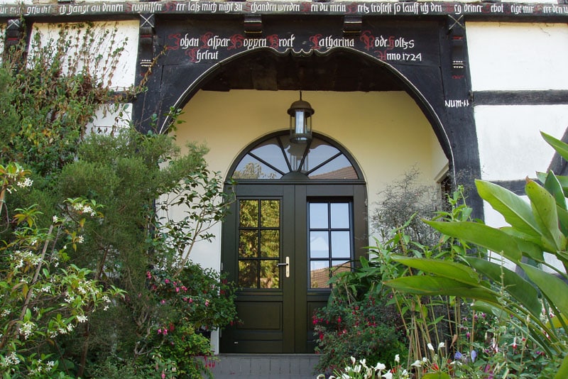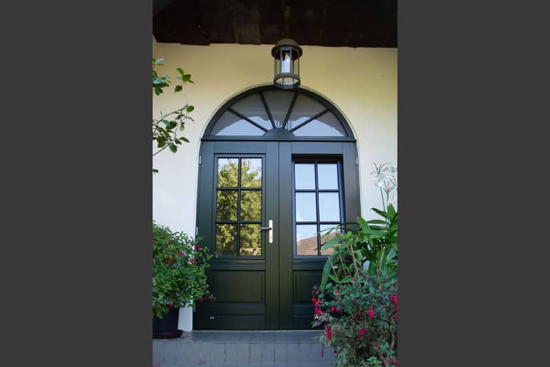 Modern gestaltete Holzhaustür mit Rundbogen, die sich in das Fachwerkhaus sanft einfügt.