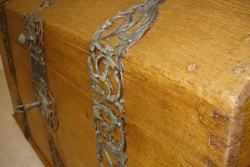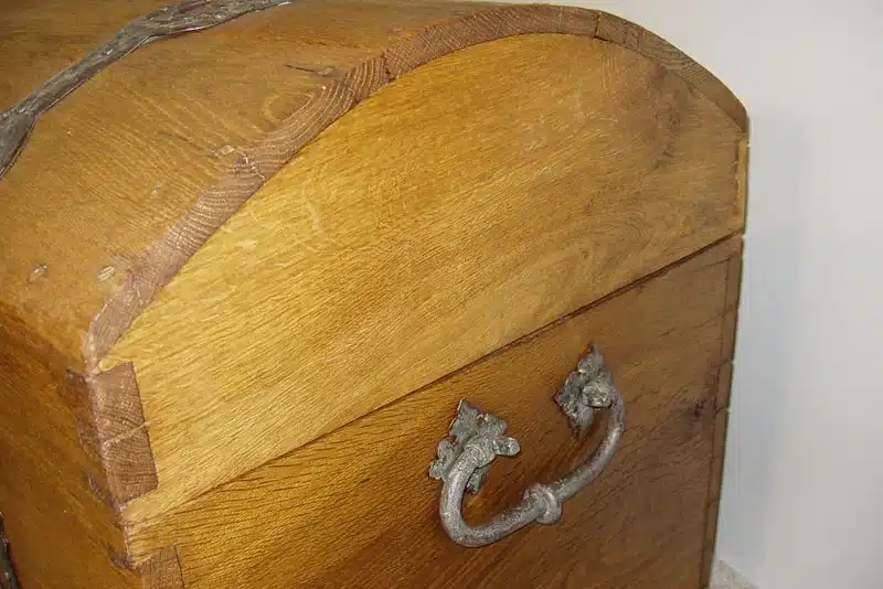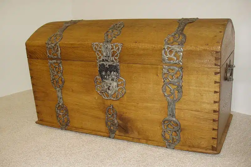 Truhe aus Eiche mit rundem Deckel und durchbrochen, geschmiedeten Eisenbeschlägen.